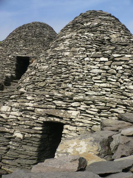 The monks lived in round 'beehive' huts at the top of the island, clustered around the ruins of a rectangular chapel. These amazing structures are built using a technique called corbelling. The stones are laid in a circular shape, gradually sloping inward until they meet at the top. It's an incredibly simple yet durable way to build - there are hundreds of these stone beehive huts all over the west of Ireland that have been standing for over 1,000 years.